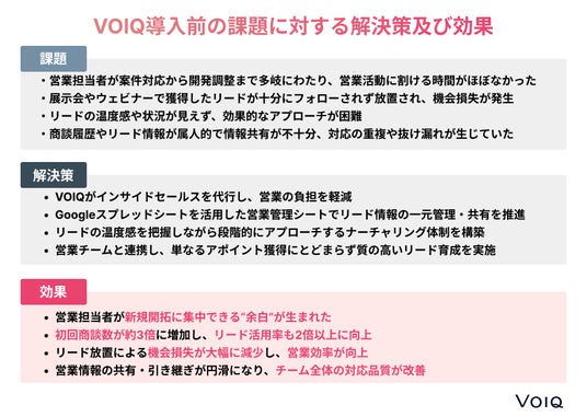 VOIQの支援により、展示会やウェビナーで獲得したリードの活用率が従来比で2倍以上に向上しました。また、リードの管理が効率化されたことで、初回商談数が導入前の3倍に増加。これに伴い、営業担当者の負担軽減と営業活動の質向上が実現し、新規案件の獲得機会を大幅に拡大しています。