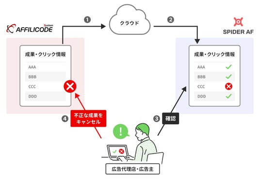 広告代理店・広告主企業にシステム提供を行うアフィリコード・システムでも、この問題を深刻に捉え対策を強化。不正検知システムのリーディングカンパニーとして、豊富なデータと高度な分析技術をもつSpider AFとの間でパートナーシップを締結しました。