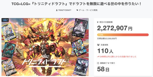 「トリニティドラフト」のクラウドファンディングの成功を記念して、支援者様に向けた特別なプロモーションカードの配布が決定しました。また、ストレッチゴールの設定も現在検討しております。
