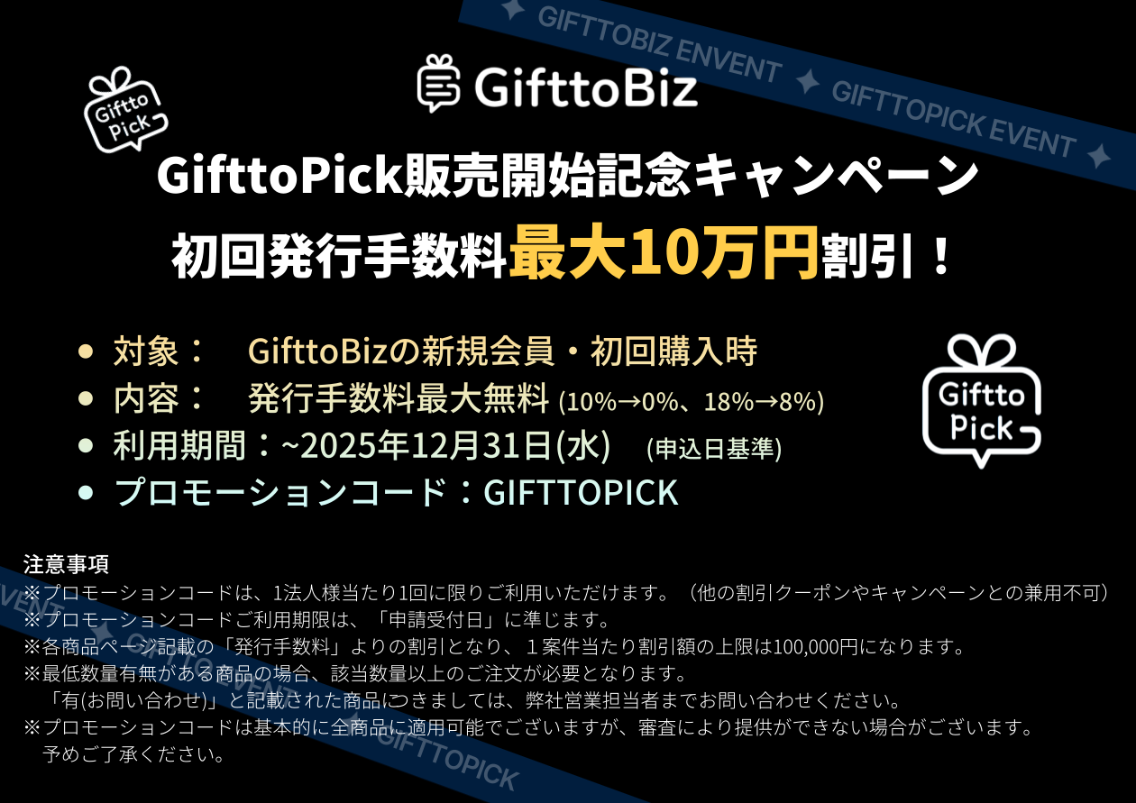 販売開始を記念し、GifttoBizの新規会員を対象に、初回購入時の発行手数料を最大10万円割引するキャンペーンを実施いたします(2025年12月31日まで)。