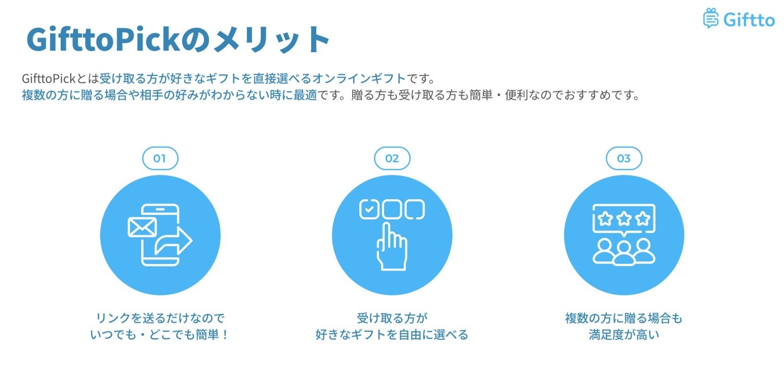 「GifttoPick」とは、受け取る方が好きなギフトを直接選べるオンラインギフトです。複数の方に贈る場合や相手の好みがわからない時に最適なギフトです。
