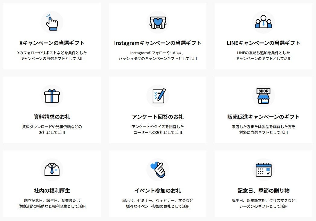 GifttoPickは様々なシーンでご活用いただけます。X, Instagram, LINEなどのキャンペーンの当選ギフト、資料請求のお礼、アンケート回答のお礼、販売促進キャンペーンのギフト、社内の福利厚生、イベント参加のお礼、記念日・季節の贈り物など、幅広いシーンで、施策の目的・予算に合わせてご活用いただけます。