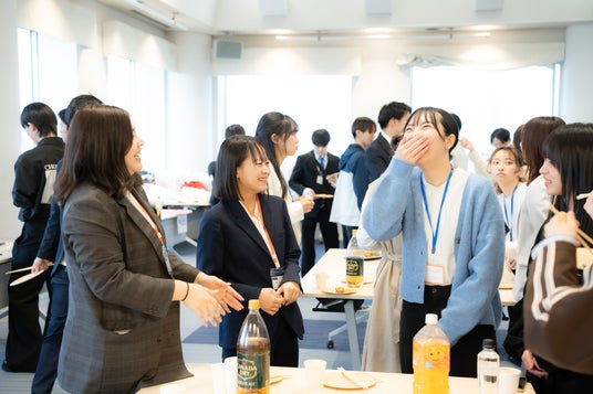 当日は企業による3分ピッチ、少人数座談会、フリータイム形式の立食交流会を実施。ピッチでは各社が自社のインターンシップや魅力を端的に紹介し、学生は短時間で複数社の特色を把握できました。立食交流会では学生から積極的に声をかける姿が多く見られ、企業担当者からは「学生が自ら話しかけてくれたのは意外でポジティブ」との声が上がりました。
