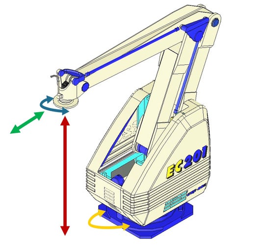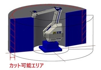 動作領域が円筒座標系のため、機器を省スペースで設置することが出来ます。また、内側に強く後部への飛び出しが少ないことも特徴です。