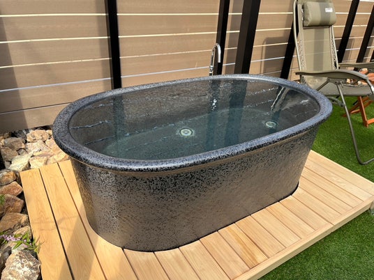 水風呂は宝石箱のようなデザインで、夜は青く輝き非日常の雰囲気に。入浴後は手前のデッキで寝転びながら外気浴ができ、心も体もととのいます。癒しと美しさを備えた、贅沢な時間をお楽しみください。