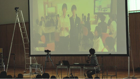 全国30箇所から寄せられたビデオには、それぞれの地域の子どもたちや合唱愛好者が『フェニックス』を歌う姿が収められており、会場の生徒たちはその映像に合わせて共に歌唱しました。