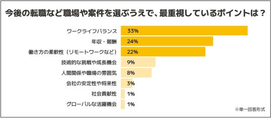 転職や案件選択で重視する項目としては、「ワークライフバランス」「年収・報酬」「働き方の柔軟性」が上位を占めました。