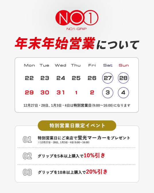 株式会社NOWON(所在地:東京都江東区 代表取締役:徳山隆)のNO1-GRIPは2026年1月1日から10日までの期間限定で〈NO1-GRIP 2026 SPECIAL LUCKY BAG〉を発売いたします。