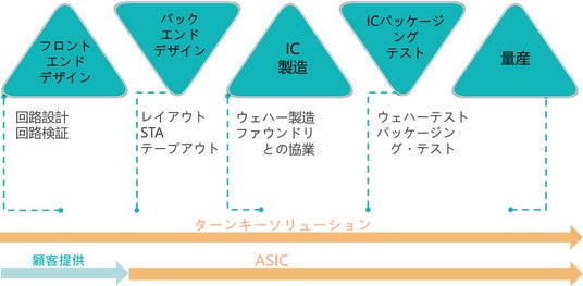 特に、ファウンドリや後工程(パッケージング・テスト)企業との緊密な連携を通じて、お客様のニーズに応じた各工程ごとの委託サービスや、ASICターンキー案件としての一括対応が可能です。