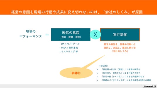 ネクセント株式会社は、中小企業がハイパフォーマンスを発揮するための実行基盤を再構築する専門家集団(運用受託/信託/専門運用集団)です。「状況認識」「パーパス意識」「思いやり」の3つのコア要素を軸に、顧客企業の「戦略実行の仕組み」をアップデートし、世界に充実感を生み出すことをミッションとしています。