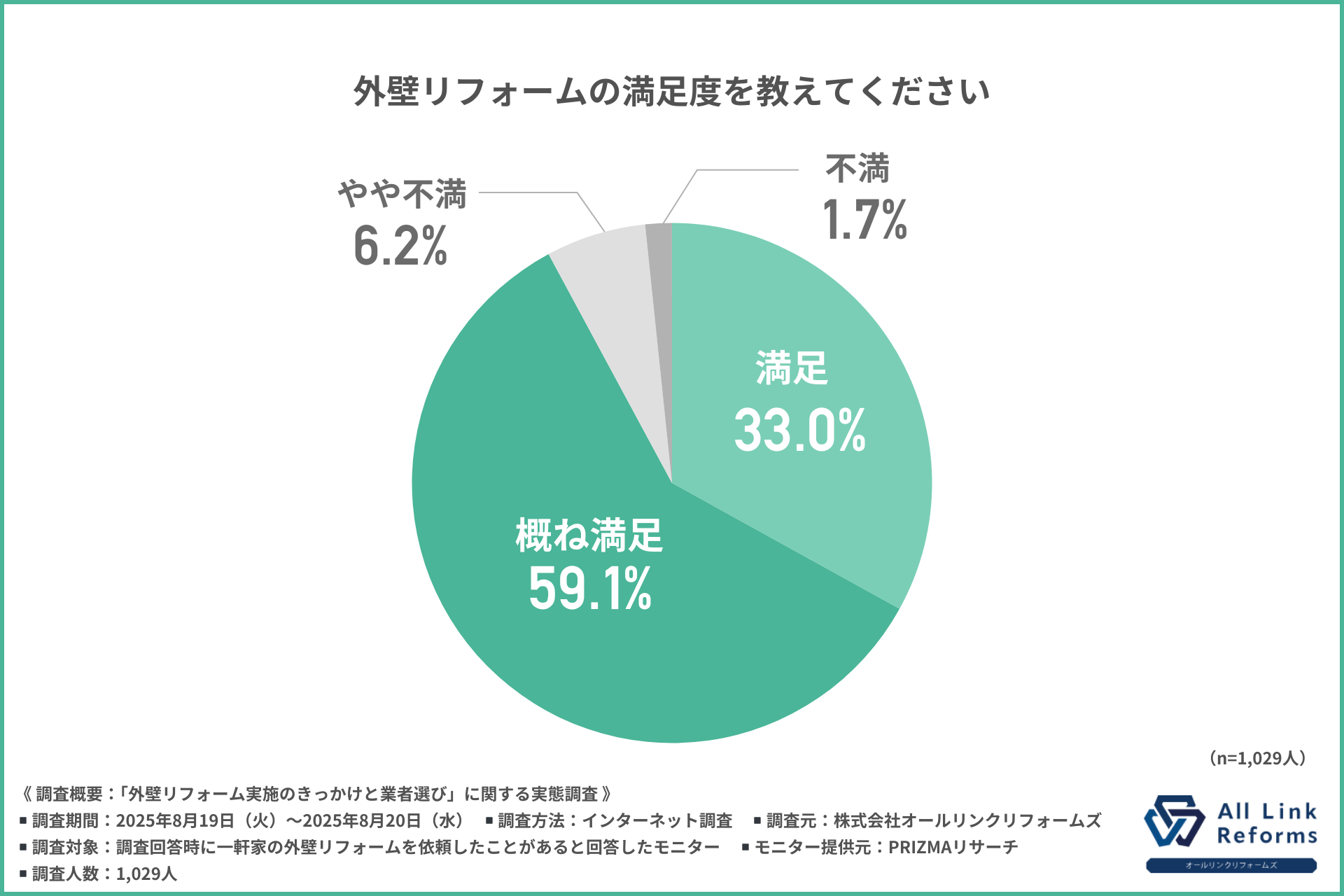 「外壁リフォームの満足度」について尋ねたところ、約9割が『満足(33.0%)』『概ね満足(59.1%)』と回答しました。