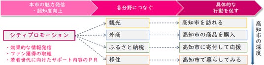 高知市の情報発信力を高めるため、訴求力の高い本市のキャッチコピー、特設サイト、動画、ロゴマーク等を制作するとともに、効果的なプロモーションを展開することにより、本市の認知度やブランド力の向上、関係人口及び移住・定住人口の増加につなげるものです。
