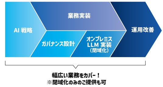 当社のオンプレミスLLM/AIエージェント構築ソリューションは、AI戦略の立案からインフラ構築、業務実装、運用・改善まで、企業の閉域環境下での生成AI活用に必要なすべてのフェーズを一気通貫でご支援するものとなります。