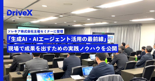 株式会社DriveX(本社:東京都渋谷区、代表取締役:永田篤広、以下当社)は、2026年2月25日に開催された、ソレキア株式会社(本社:東京都大田区、代表取締役社長 小林 義和、以下ソレキア社)主催のセミナー「AI導入の壁をどう突破するか?」に、当社代表取締役 永田篤広とCTO 楠亀晃星が登壇したことをお知らせいたします。