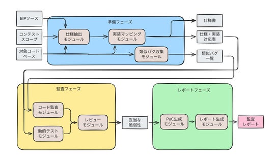 また、Nyx Foundationが開発したセキュリティエージェントは、複数のモジュールから構成されており、プロのホワイトハッカーが実施する監査プロセスを模倣する設計となっています。