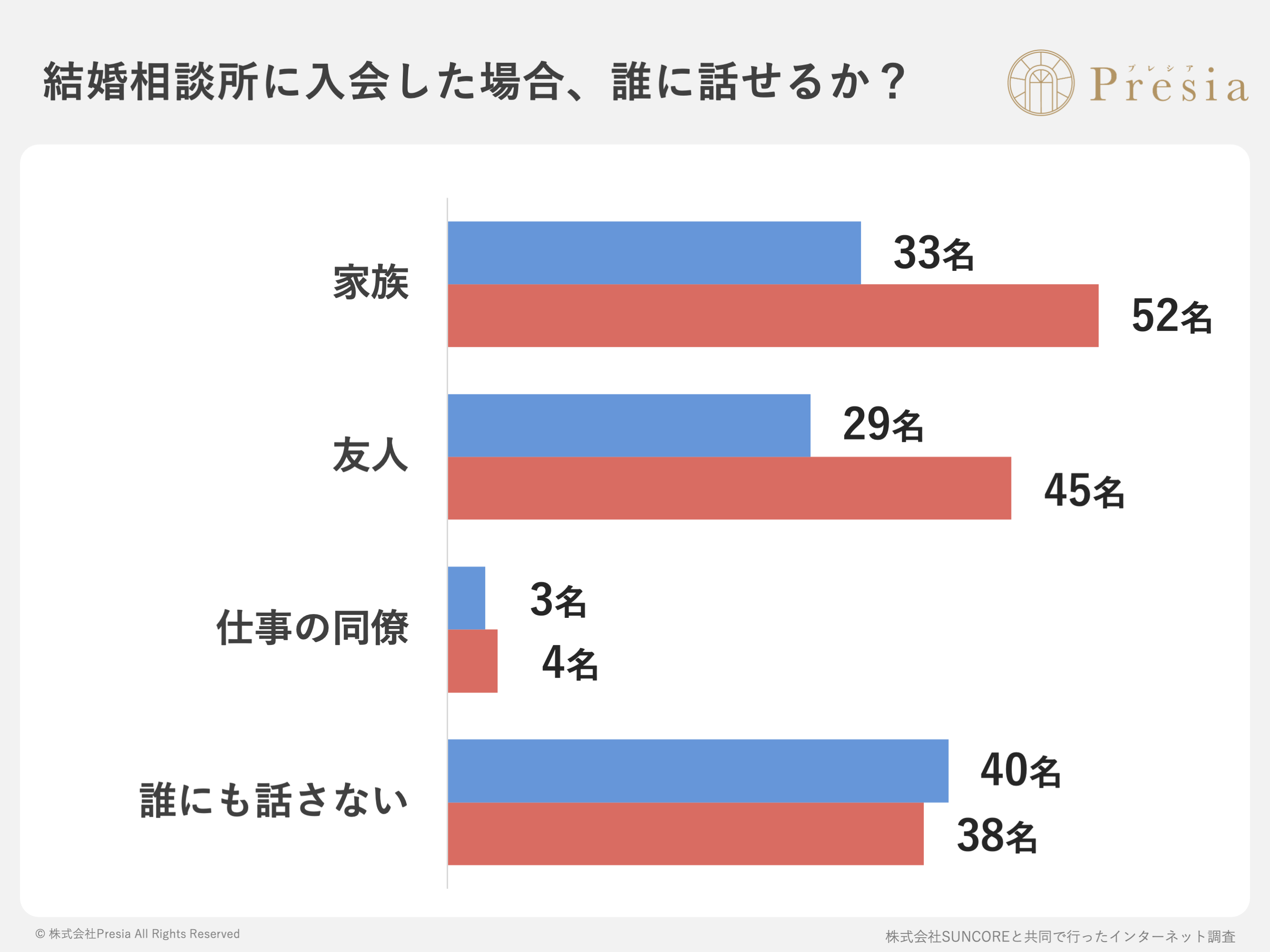 こうしたネガティブなイメージを反映してか、「もし結婚相談所に入会した場合、誰に話せるか」という質問では、男女ともに「誰にも話さない」が最も多い回答の一つとなりました。