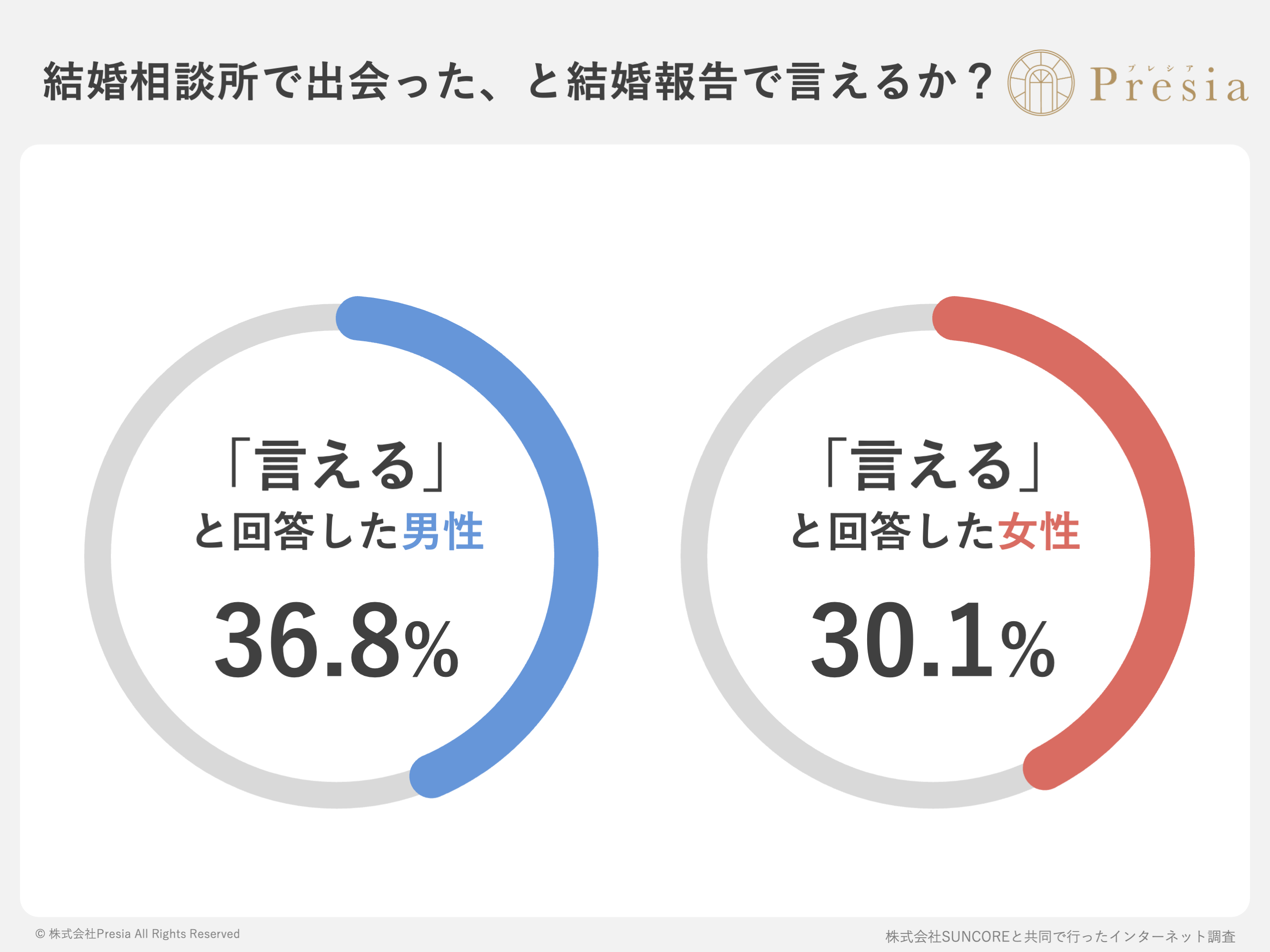 さらに、「結婚報告の際に『出会いは結婚相談所』と言えるか」という質問では、「はい、言える」と回答したのは男性で36.8%、女性では30.1%に留まりました。