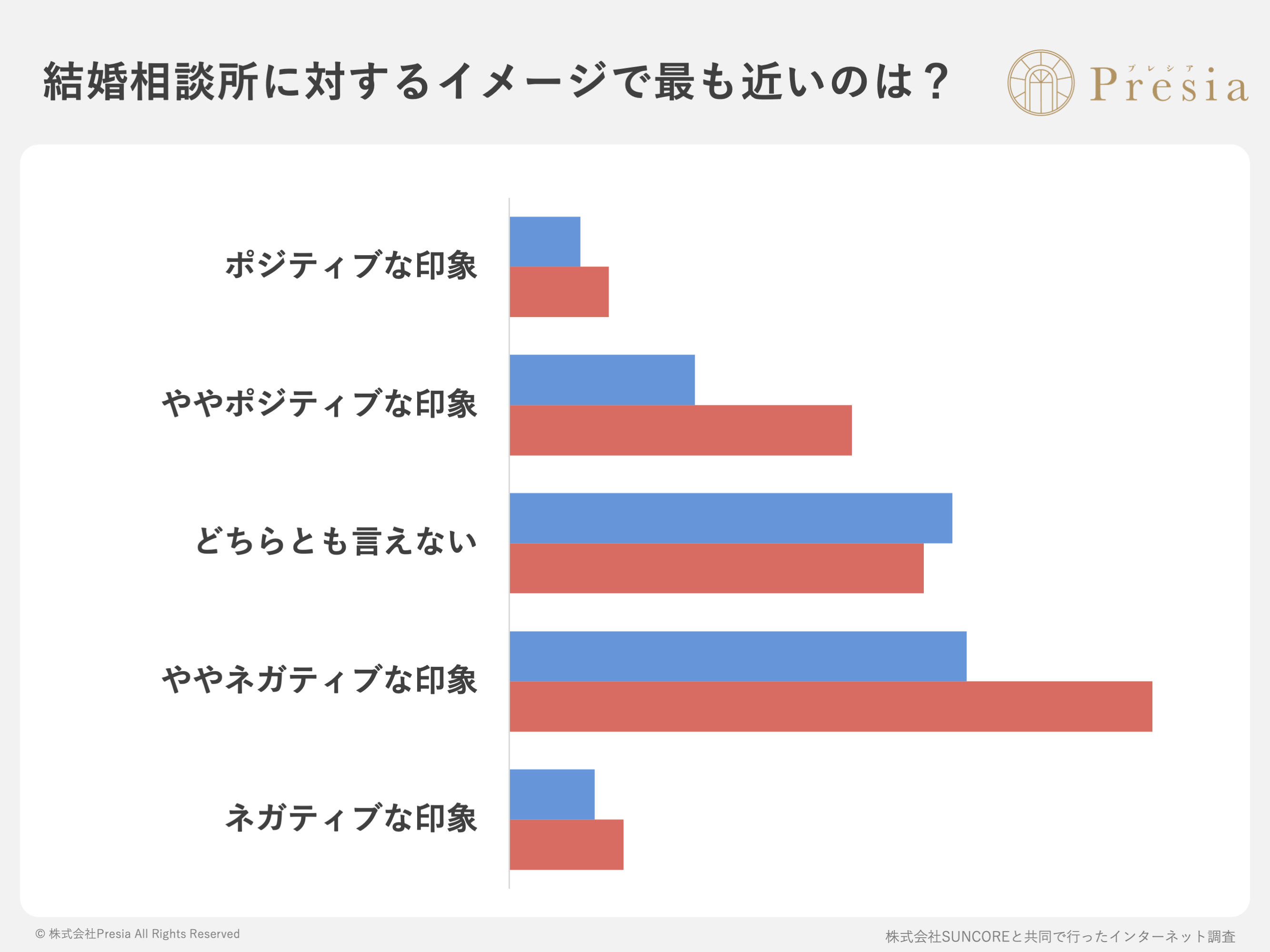 また、「結婚相談所の第一印象」については、男女ともに「ややネガティブな印象」が最も多く、ポジティブな印象を上回る結果となりました。