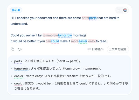 修正すべき点があればハイライト表示され、修正案もあわせて提案されます。