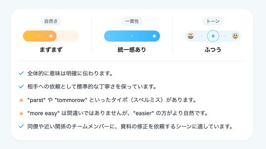 これにより、文章トーンが適切か、あるいは文体が混在していないかといった、ネイティブから見たときに不自然なポイントをすばやく把握できます。