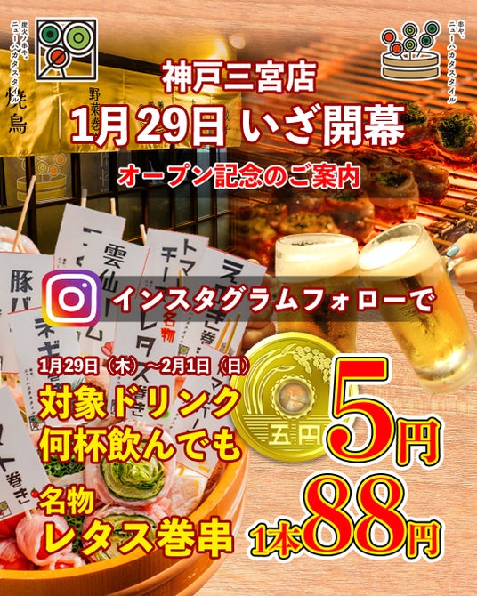 株式会社MS Group(本社:大阪府大阪市、代表取締役:白戸武蔵)は、2026年1月29日(木)に、「炭火ノ串や。ニューハカタスタイル三ノ宮駅前店」をオープンいたします。同ブランドで11店舗目の出店となります。オープンを記念して、1月29日(木)~2月1日(日)限定でお得なキャンペーンを開催します。