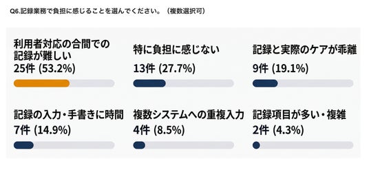 記録業務で負担に感じることを尋ねたところ、「記録のタイミング(利用者対応の合間に記載)が難しい」が53.2%でトップでした。「記録と実際のケアが乖離してしまいがち」が19.1%、「記録の入力・手書きに時間がかかる」が14.9%と続きました。