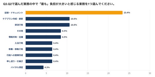 また、「最も負担が大きい業務(1つ選択)」でも、「記録・ドキュメント入力」が23.4%でトップでした。ケアプラン作成・更新(10.6%)や排泄介助(10.6%)が続きました。