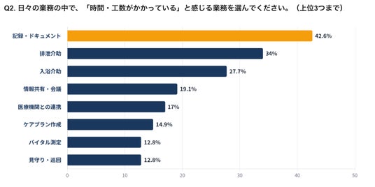 「時間・工数がかかっている」と感じる業務(上位3つまで選択)を尋ねたところ、「記録・ドキュメント入力」が42.6%でトップとなりました。次いで「排泄介助(おむつ交換含む)」34.0%、「入浴介助」27.7%と、身体介護と事務作業が上位を占めました。