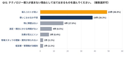テクノロジー導入が進まない理由を尋ねると、「導入コストが高い」が48.9%で最多でした。「使いこなせるか不安」が38.3%で続き、費用面と習熟面の両方がボトルネックとなっていることが分かります。