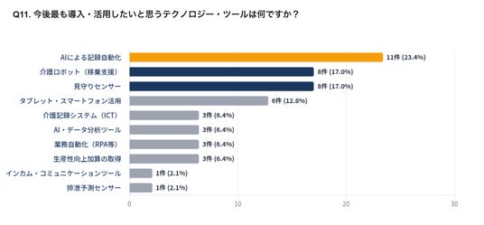 今後最も導入・活用したいテクノロジーを尋ねたところ、「AIによる記録自動化」が23.4%でトップでした。次いで「介護ロボット(移乗支援)」「見守りセンサー」がともに17.0%で続きました。