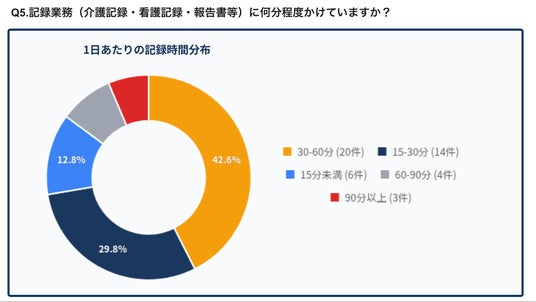 「記録業務(介護記録・看護記録・報告書等)に1日あたり何分程度かけているか」を尋ねたところ、「30~60分」が42.6%で最多。60分以上かける職員も合わせると、57.4%が1日30分以上を記録業務に費やしている実態が明らかになりました。