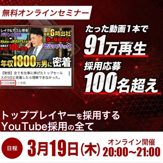 株式会社One Rep(本社:東京都渋谷区、代表取締役:秋本凌吾)は、2026年3月19日(木)に無料オンラインセミナー「トッププレイヤーを採用するYouTube採用の全て」を開催します。