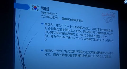 次に、気候正義訴訟の弁護団の吉田弁護士より、世界の気候変動訴訟について解説。将来世代にツケを回す対応が違法になったドイツや、10代の若者19名が提訴し国の義務を認めた韓国の若者気候訴訟など、世界各国における気候変動対策における国の責任について説明しました。