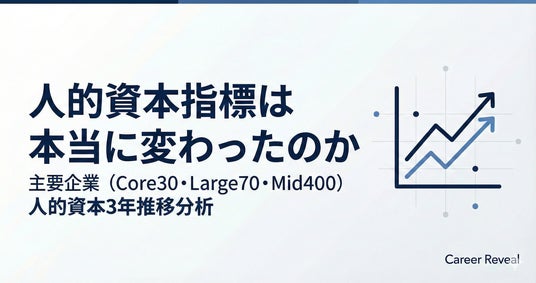 株式会社エフペリ(本社:東京都、代表:早見信吾)が運営する人的資本データ分析プラットフォーム「Career Reveal(キャリア・リビール)」は、東京証券取引所が定める株価指数の構成企業群である「Core30」「Large70」「Mid400」(※2025年10月改定前の企業群を採用)を中心とした主要企業について、有価証券報告書等の公開情報をもとに、人的資本指標の3年推移(2023~2025)を横断的に集計・分析しました。