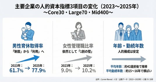 「Career Reveal」がCore30・Large70・Mid400の公開情報を横断分析。平均年齢・勤続年数は安定推移する一方、制度利用と組織登用の変化スピードに差が見られる結果となった。