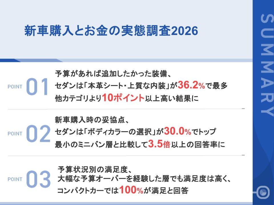 株式会社クルカは、直近3年以内(2022年1月以降)に新車を購入し、購入時の意思決定に関与した方 1,076名を対象に、新車購入とお金の実態調査2026を実施しましたので、お知らせいたします。本リリースでは、車のカテゴリ別に見た「妥協した点と"本当は欲しかった装備"のズレ」を分析した結果をお知らせいたします。