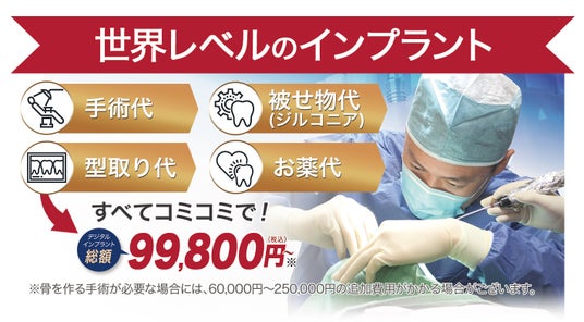 ・メリット:独自の表面処理技術により、高齢の方や糖尿病などの持病がある方でも高い骨結合が期待できます。また、当院独自の「一生保証」にも対応しております。