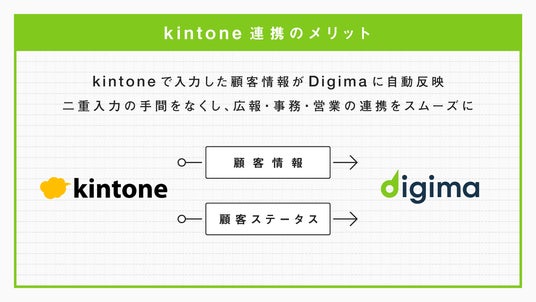 本連携により、kintoneとDigimaそれぞれで管理されていた顧客情報が一元管理できるようになり、営業プロセス全体を一気通貫で管理できるようになるとともに、情報の二重入力の削減や営業品質の向上を実現し、営業組織全体の生産性向上を支援します。