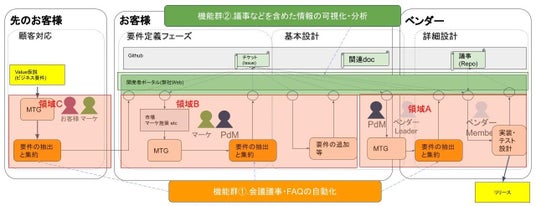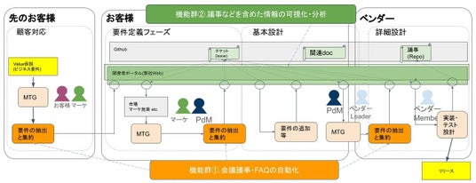 機能群1.の「議事録の自動生成」「議事録の分析」を通じて、機能群2.ではコミュニケーション状況を可視化・分析し、企業担当者と開発ベンダー(ビジネスサイドと技術サイド)が共に改善に利用することで、開発生産性の向上を図ります。