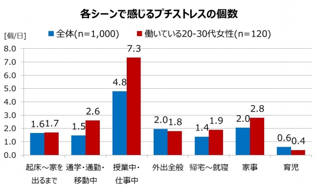 生活の各シーンで感じるプチストレスの個数について調べたところ、一日のうちでも多くの時間を費やす仕事におけるプチストレスが多く、一日を通して足し上げると、働く20~30代女性で「18.5個」、つまりおよそ「52分に1個」※のプチストレスを感じていることが分かりました。(全体では一日13.9個、約69分に1個)。