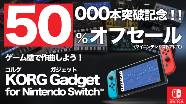 株式会社DETUNE(代表取締役社長:佐野信義 / 所在地:東京都杉並区)は、株式会社 コルグ(代表取締役社長 : 加藤世紀 / 所在地:東京都稲城市)との共同開発によるNintendo Switch™用音楽制作ソフト「KORG Gadget for Nintendo Switch™」(コルグ ガジェット フォー ニンテンドー スウィッチ)の累計販売本数が50,000本を突破したことを記念して、マイニンテンドーストアにてダウンロード版の50%オフセールを行うことをお知らせします。