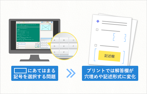 画面上で選択問題のものを、プリントでは穴埋め問題・記述問題などに変化させる
