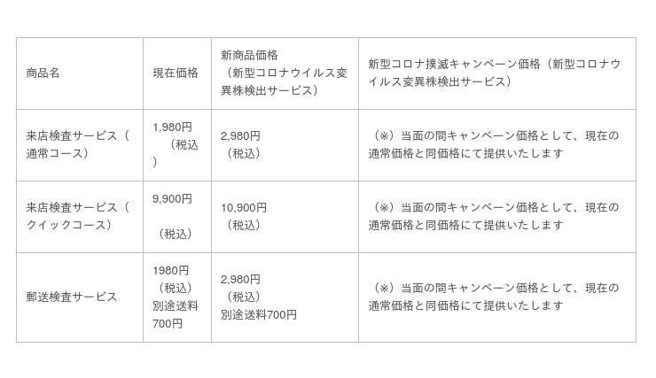 また、弊社では、新試薬「PCR-EM新型コロナウイルス変異検出試薬」を使用した検査サービスを開始し、従来の陰性・陽性の判定に加えて、「変異株の検出、特にデルタ株等のウイルス変異株を特定した検出サービス」を7月1日より開始します。当面は、デルタ株等のウィルス変異株の検出を、従来の価格(翌日通知1,980円~、以下価格表参照ください)に含めてサービスを提供して参ります。