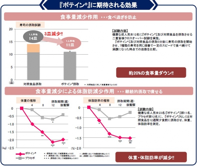 食事をすると脳に満腹感を伝える満腹ホルモン(CCK*)が分泌されます。『ポテイン(R)』はその満腹ホルモンの分泌を促進する作用があるため、従来のダイエットでストレスとなっていた空腹感を感じにくくさせることで、食べ過ぎを防ぎ無理のないダイエットが期待できます。