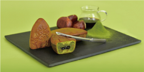 かすてら生地、餡、蜜、すべてに宇治抹茶を使用。小さな栗の甘露煮を合わせた自家製餡の中に抹茶黒蜜を閉じ込め、伝統の製法でしっとりと焼き上げました。