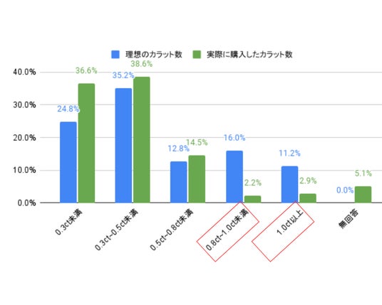 アンケートから浮かび上がった理想と現実図は婚約指輪の理想のカラット数(出典:自社アンケート)と、実際に購入したカラット数(出典:※1)の比較です。特に、0.8ct 以上の婚約指輪の購入においては、理想と現実に大きくギャップが出ていることが分かります。