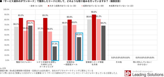「サービス資料のダウンロード」リードへの取り組みについて、全体と比較して「電話でのフォロー」は割合が高いものの、「MAによるナーチャリング」は約27pt、「一括配信メール」は23ptのマイナスとなった。