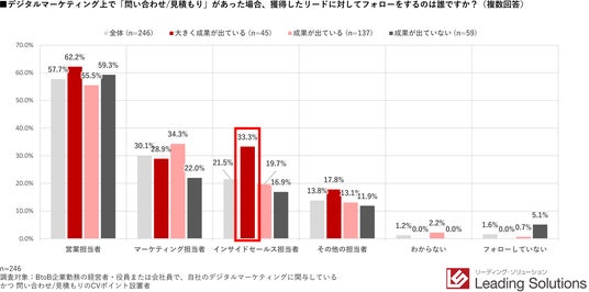 デジタルマーケティングで「大きく成果が出ている」と回答した属性では、「問い合わせ/見積もり」に対してインサイドセールス部門によるフォローの割合が他回答者属性よりも高い結果となった。