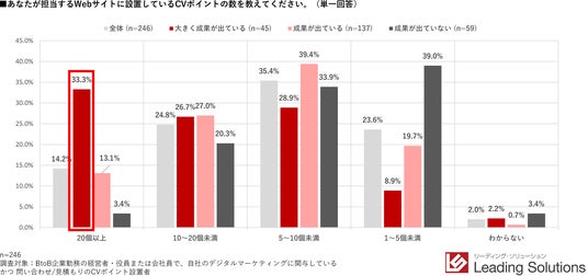 ・デジタルマーケティングで「大きく成果が出ている」と回答した属性は、CVポイントを20個以上保有しており、潜在層~顕在層向けまで網羅的にCVポイントを設置している様子が見受けられる。