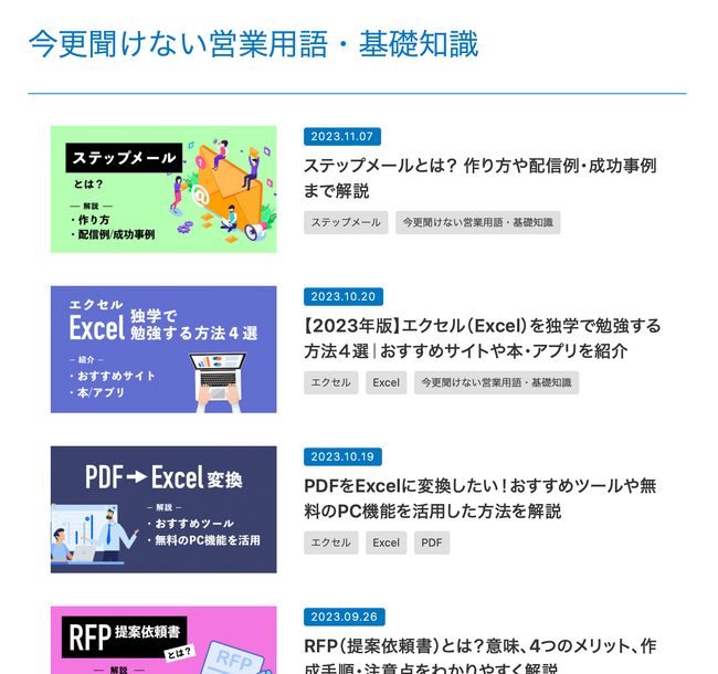 上記の用語も含む「営業用語」「基礎知識」「営業フレームワーク」「営業ツール活用法」のまとめ一覧ページです。